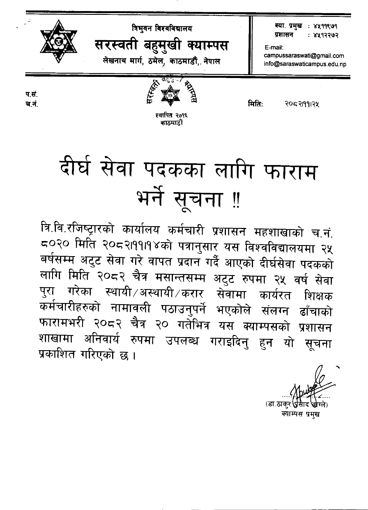 Saraswati Multiple Campus, located at Lekhnathmarg, Thamel, Kathmandu, is one of the oldest campuses of TU. Established in 2016 BS as Saraswati Inter College, it has a rich history of over 50 years. Initially offering night classes in Humanities, SMC now provides Bachelor's and Master's programs in Business Studies, Business Management, Business Administration, Hotel Management, English, Nepali, Mathematics, Sociology, Economics, Political Science, Culture, History, and Rural Development. It is the first campus in Kathmandu Valley to introduce the semester-based BBM program in 2071 BS.